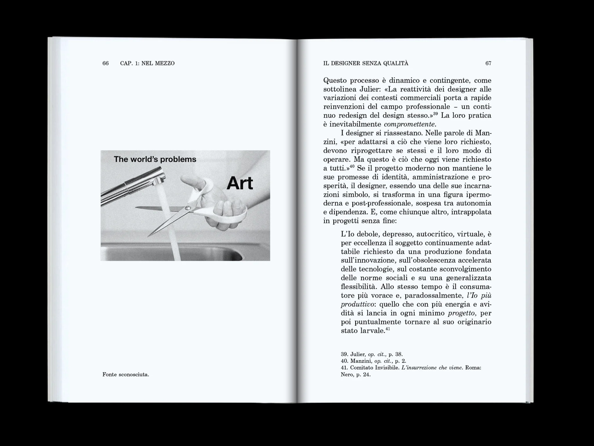 Ma siamo sicuri che questa disillusione non sia uno strumento per immaginare qualcosa di nuovo? Può, ad esempio, tradursi in un metodo emotivo per portare alla luce disfunzioni e contraddizioni? Può insomma, per dirla alla Weizman “estetizzarci all’investigazione”? Ne Il designer senza qualità Lorusso segue le tracce passate e presenti della disillusione progettuale, nel tentativo di colmare il divario tra aspettative e realtà nella pratica quotidiana dei designer.