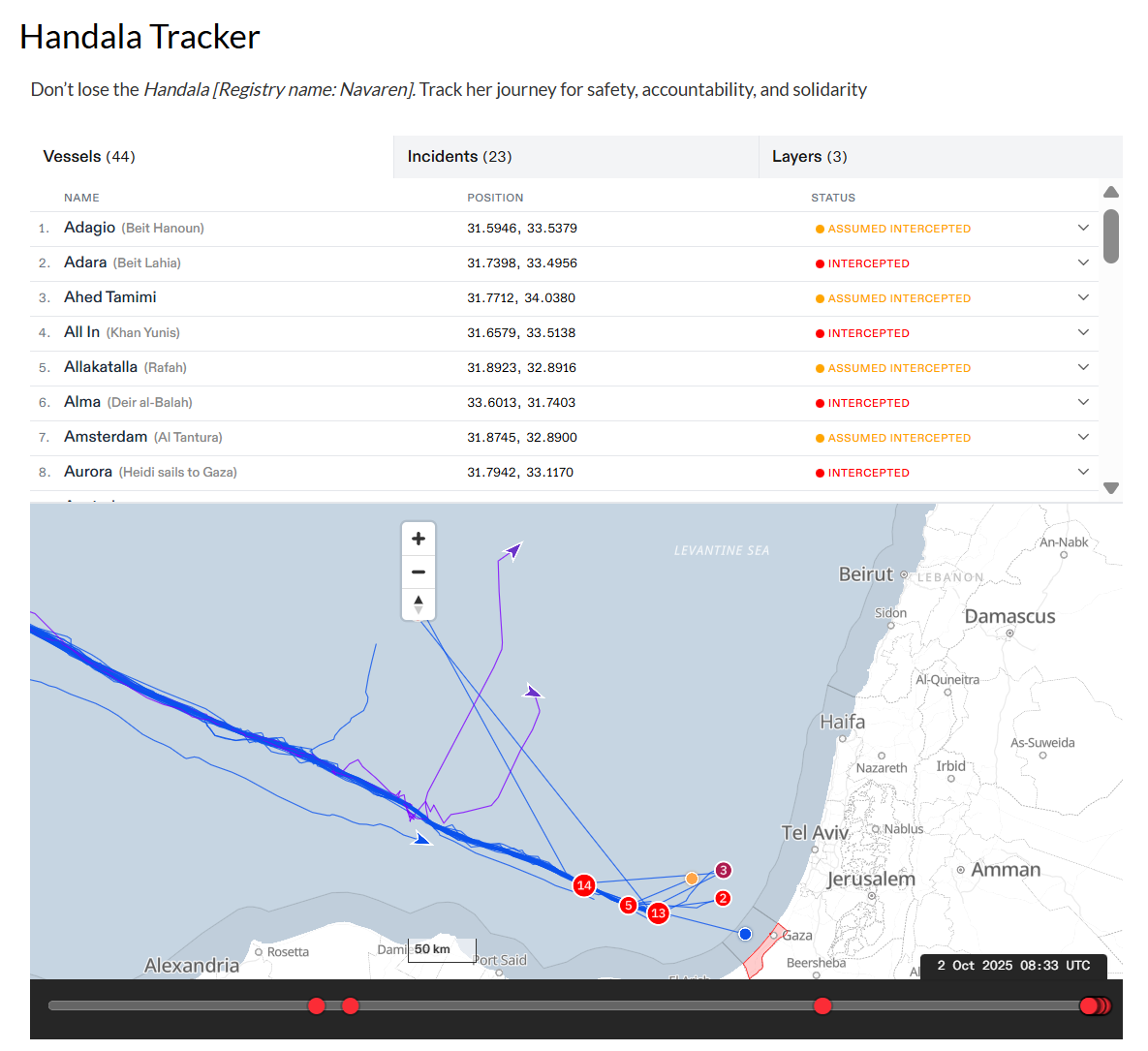 Rimaniamo in tema mostri. Mentre scriviamo, siamo all’indomani dell’operazione con cui l’IDF ha assaltato e fermato 21 delle barche della Flotilla in viaggio verso Gaza. Al momento sono poche le barche ancora in viaggio. Forse avrete già notato che Forensic Architecture ha messo a disposizione del movimento un sistema avanzato di tracking, per monitorare ed esporre la situazione. Che, come vedete, è drammatica.