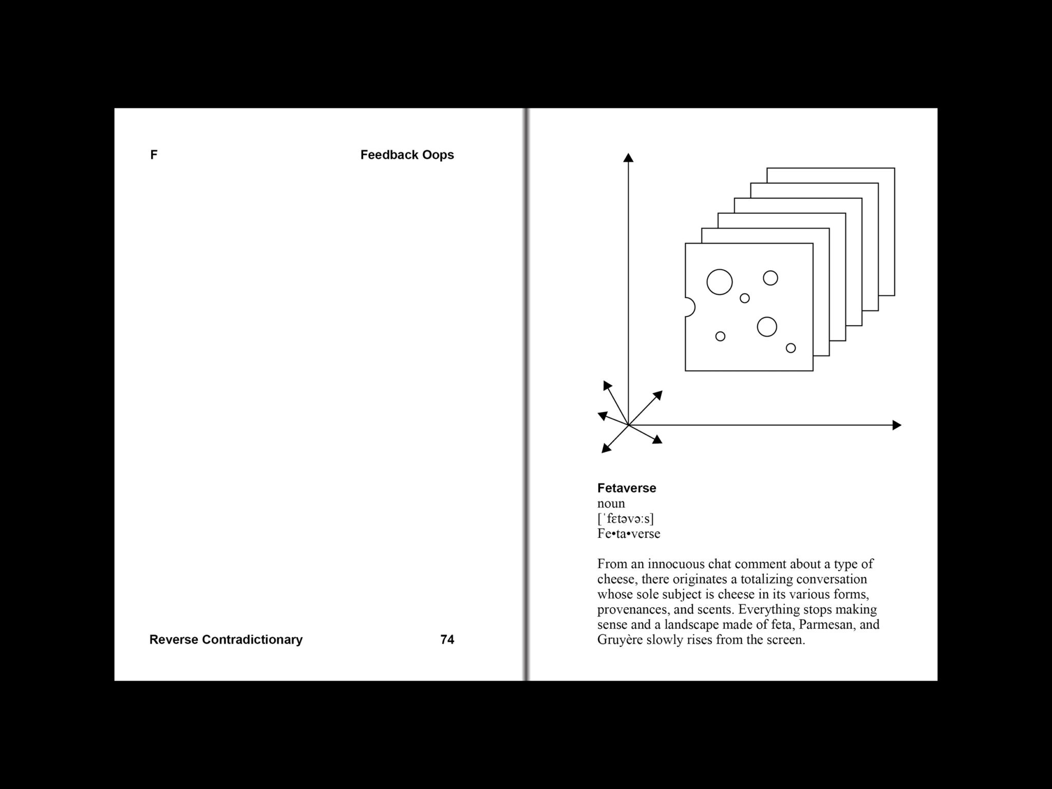 Linguaggio, dicevamo. Reverse Contradictionary. Dictionary of the New Worlds, di Vuk Cosic, Vladan Joler e IOCOSE (appena uscito, qui il link) è un dizionario di nuove parole eretiche, esercizio di resistenza linguistica e via di fuga dalla normatività del linguaggio all’epoca della Statistica Semantizzata dei Large Language Models.