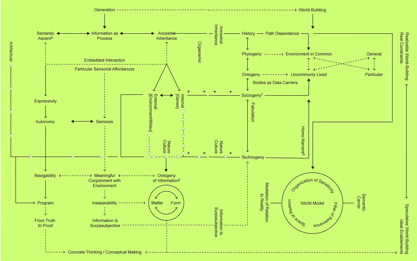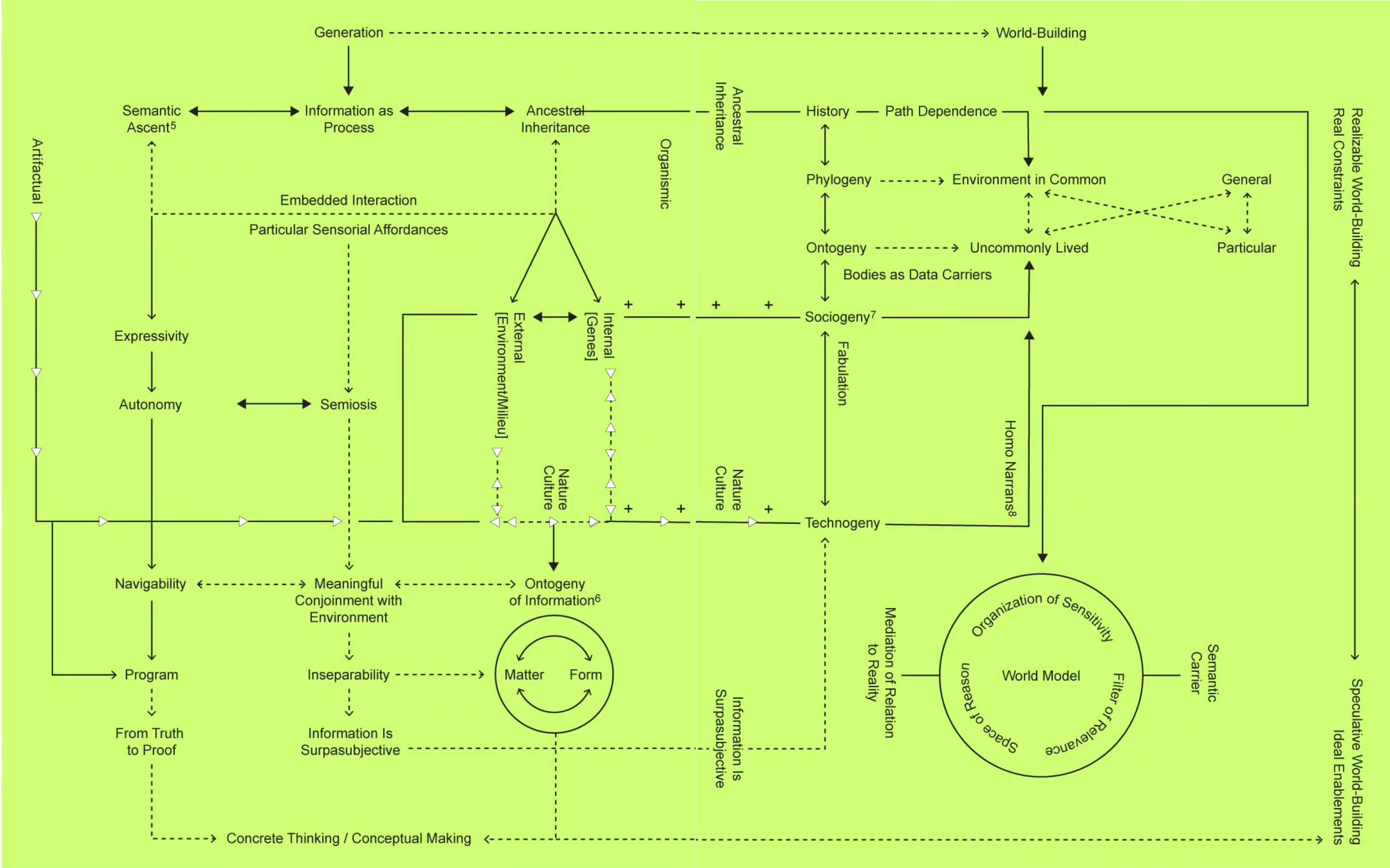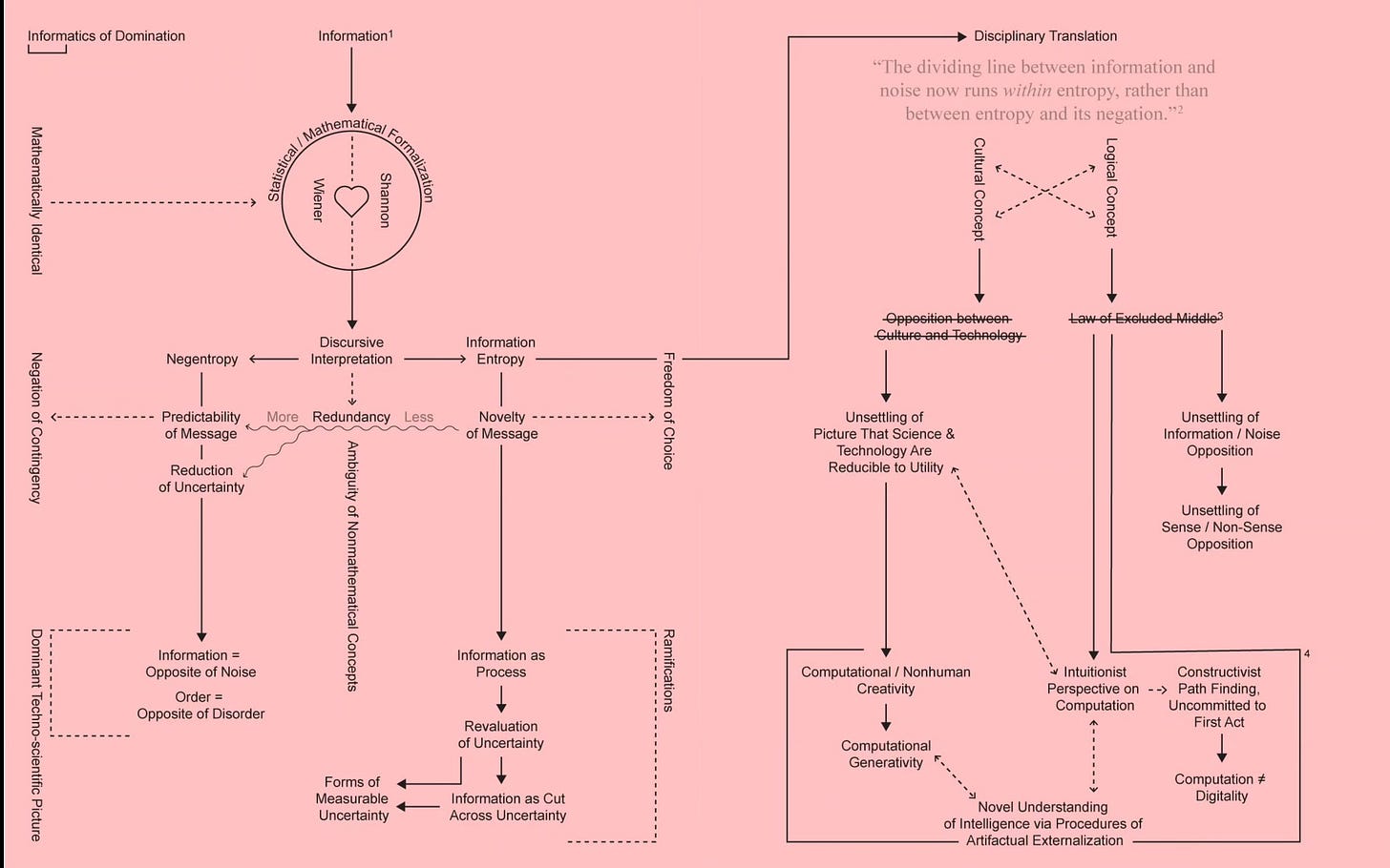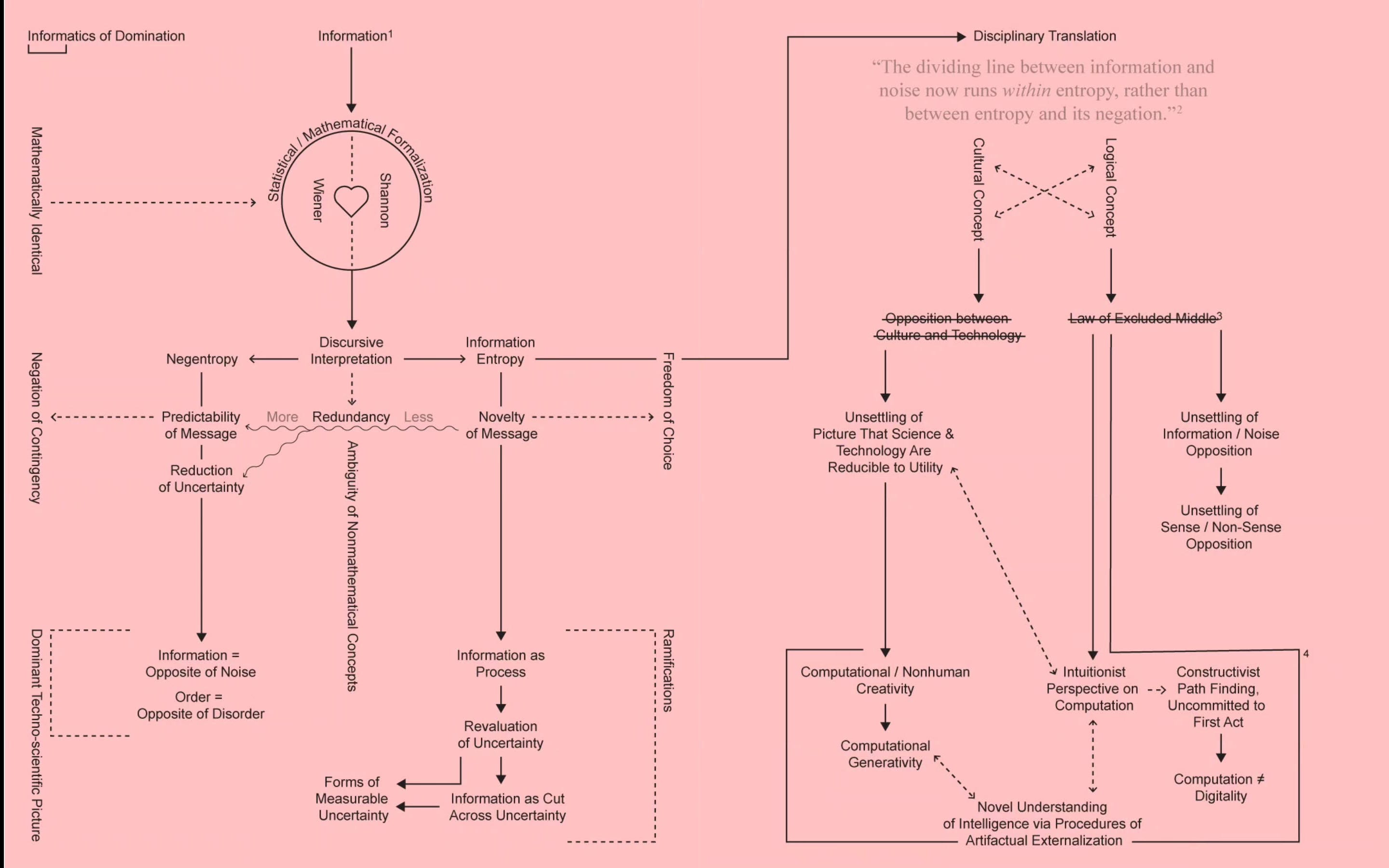 Apriamo questa sezione parlando di un epilogo. Il libro Informatics of Domination , si chiude con due diagrammi. L’ultimo capitolo del testo – a cura di Zach Blas, Melody Jue, Jennifer Rhee, e con un testo di Donna Haraway–si interroga sulle fondamenta stesse dell’Informatica del Dominazione: cosa intendiamo davvero per “informazione”? E in che modo questa definizione interferisce con i dispositivi di dominazione?